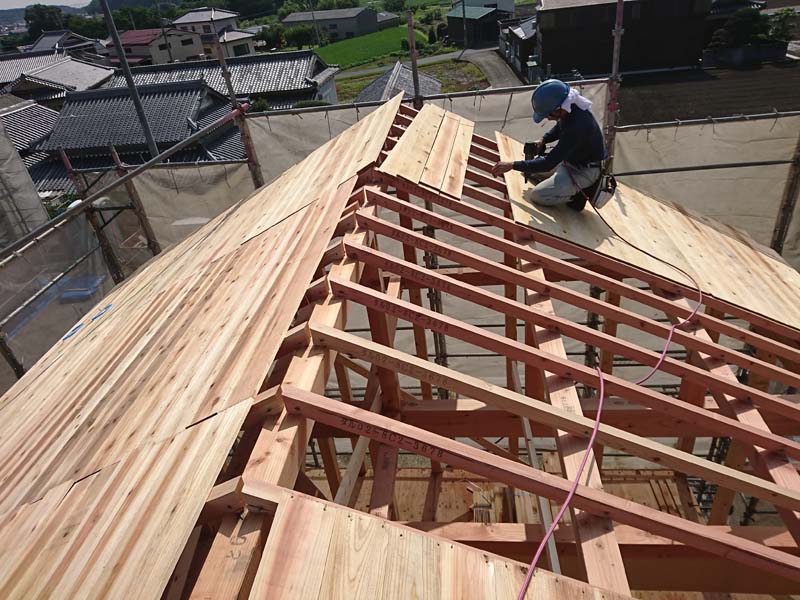 屋根仕舞いをし、ルーフィングを貼り終え